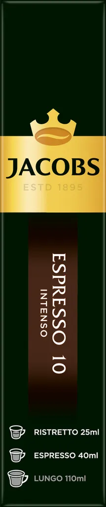 Der starke Espresso Jacobs Espresso 10 Intenso verbindet den würzigen Geschmack von Robusta mit den süßen und fruchtigen Noten des Arabicas. So entsteht der kraftvolle Jacobs-Espresso mit einem lang anhaltenden Geschmack und intensiven Abgang.